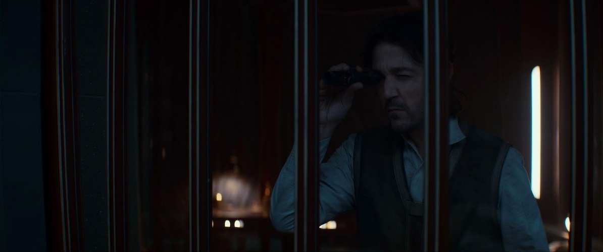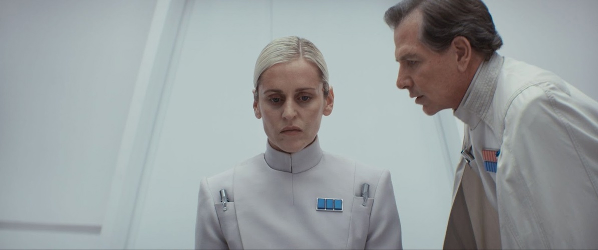 We dissolve to the fourth moon of Yavin at nighttime, where rebel forces make themselves busy repairing ships and so forth. In the woods, Wilmon’s (Muhannad Bhaier) girlfriend Dreena (Ella Pellegrini) tells him that a radio under his bed started going off, and he begins to panic. In another hut nearby, Cassian Andor (Diego Luna) plays a dominoes-like game with Melshi (Duncan Pow) and K-2SO (Alan Tudyk). Melshi places a large bid and K-2SO tries to decipher the strategy. “This is your last chance to recall your wager," says K, when Wilmon enters carrying the radio device. At ISB headquarters on Coruscant, Heert presents Major Partagaz (Anton Lesser) and Director Krennic with a hologram image of Kleya Marki. Krennic orders Heert to find Kleya using any means necessary. Heert asks what the charge is, and Partagaz comes up with a cover story that Marki is diseased and spreading a deadly virus. When Heert leaves, Krennic reads Partagaz the riot act. “We were moments away. Days!" “Save it for Palpatine," Partagaz replies. “Best of luck to us both."