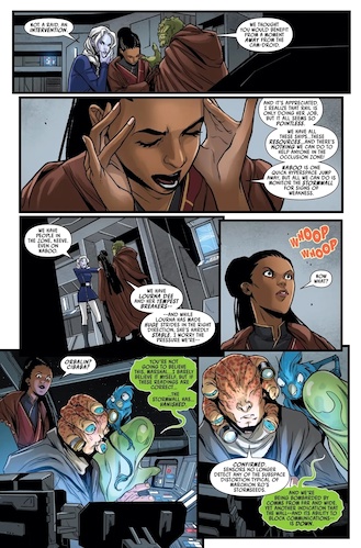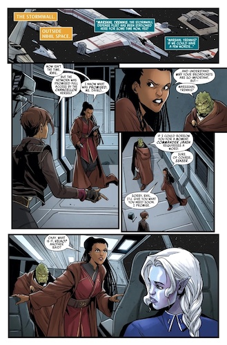 The High Republic - Fear of the Jedi #2 begins outside of Nihil-controlled space aboard the Republic longbeam Gios. Marshal Keeve Trennis is frustrated by having to deal with the GoNet reporter Rhil Dairo, so her fellow Jedi help her out by calling her to the bridge, where they soon discover that the Stormwall dividing the galaxy has suddenly disappeared. We saw that same major event happen (from a different perspective) last week in the pages of Dark Horse Comics’ Star Wars: The High Republic Adventures, but we still don’t know who or what exactly brought the Stormwall down. I suspect we will discover more about those circumstances in an upcoming novel, but for now it’s enough to know that the Republic fleet has access to the Occlusion Zone.