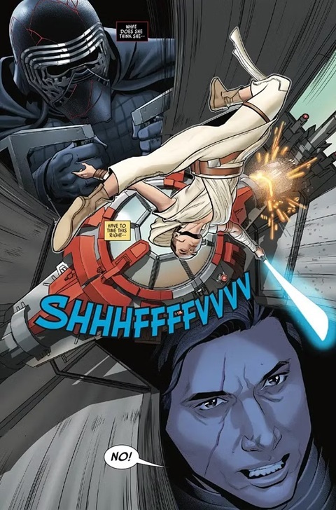 The good news is that the artwork by Will Sliney is still worth the price of admission (namely $4 bucks), and writer Jody Houser does continue to give us more mindscreen thought bubbles from Kylo, Rey, and company. There’s also a very striking image of this Force Dyad perched upon Palpatine’s throne that I don’t believe we’ve seen elsewhere, so that’s definitely something. Anyway we follow our heroes to Kijimi in search of the lovable droidsmith Babu Frik, meet Zorii Bliss, and discover that Poe Dameron was once a spice runner (see author Alex Segura’s fun 2020 young-adult novel Star Wars: Poe Dameron - Free Fall for more on that) before joining the Resistance. Plus there’s a rather touching extended scene between General Leia Organa and Maz Kanata on Ajan Kloss that we couldn’t have had in the movie because actress Carrie Fisher was sadly not around to record new dialogue.