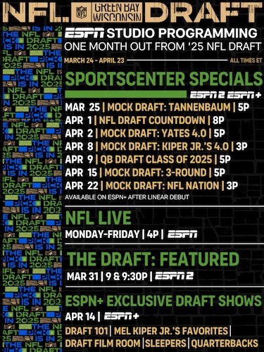 - ESPN is gearing up for the 2025 NFL Draft with programming announcements across all platforms.