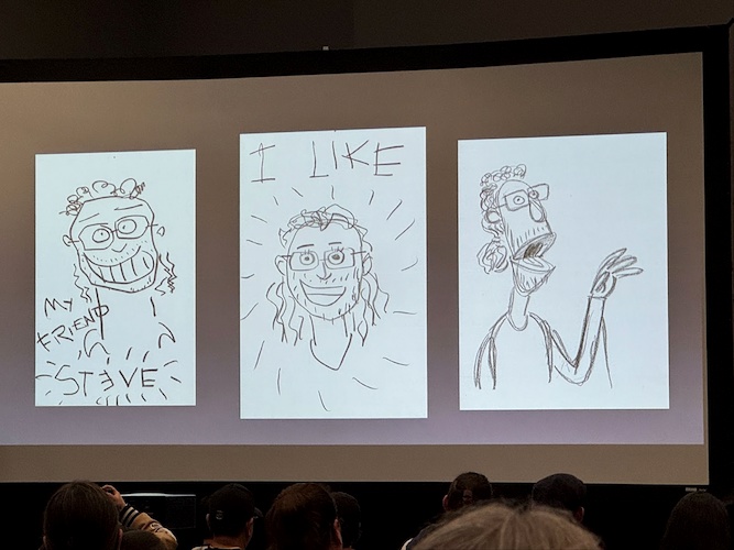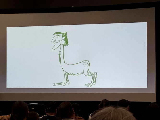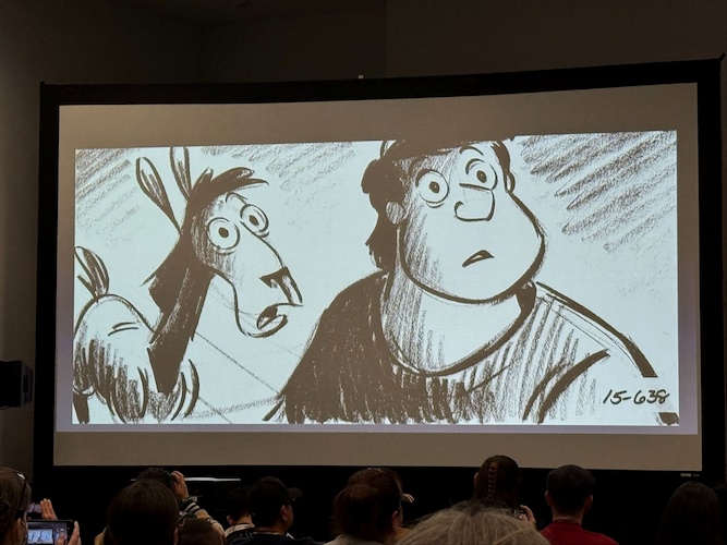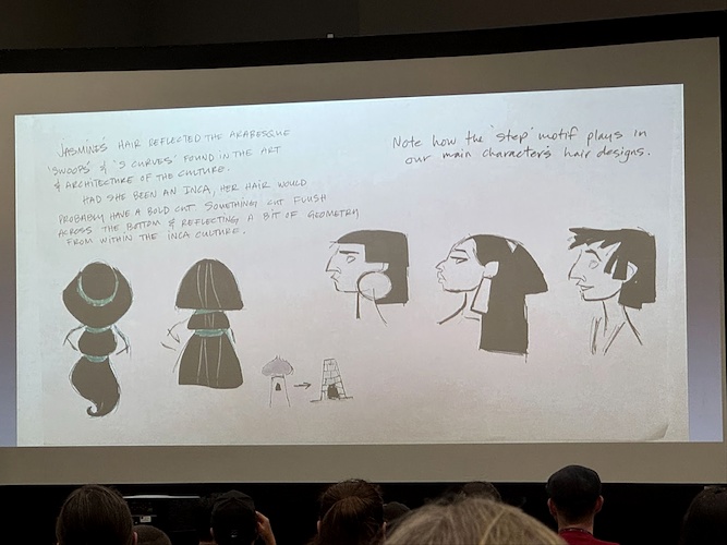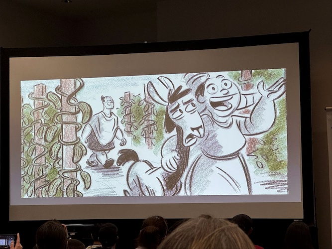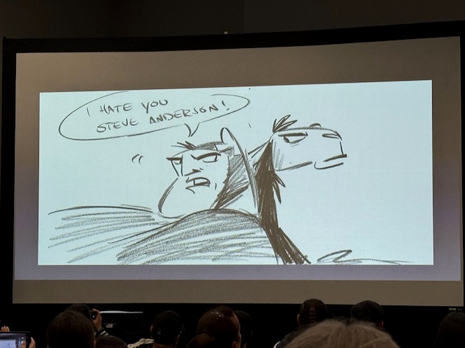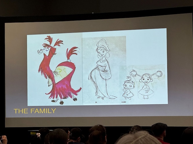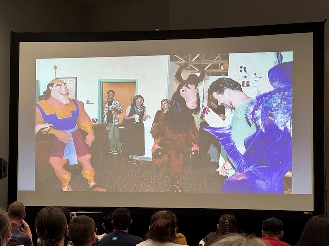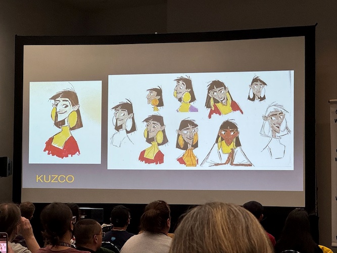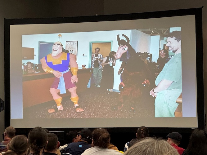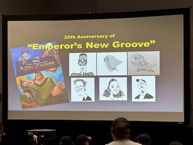 The panelists for this 25th anniversary discussion of The Emperor’s New Groove were as follows: story artist Jeff Ranjo (Moana), story supervisor Steve Anderson (Meet the Robinsons), character designer Joe Moshier (Spider-Man: Across the Spider-Verse), assistant production manager Tracey Miller-Zarneke (Chicken Little), and screenwriter Dave Reynolds (Finding Nemo).