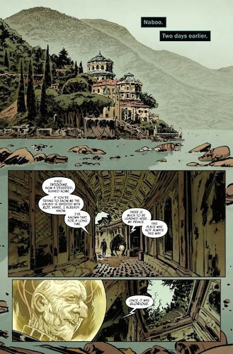 Back in the bookend “present" of the story, Kylo asks Hux if his throne has been completed (“It remains in progress.") and then transmits a message back down to the surface of Naboo, crowning himself the new king of the once-prosperous planet. I thought this was another great issue of Legacy of Vader, buoyed by both Soule’s top-notch writing and the art by extremely talented illustrator Stefano Raffaele with colorist Nolan Woodard. I’m absolutely loving Kylo Ren’s ongoing tour of his grandfather’s past, though I doubt he’ll actually learn any of the real lessons being handed to him by Vaneé, who probably still doesn’t have Ren’s best interests at heart anyway. I feel like we don’t have a ton of information about what becomes of Naboo after this point in the larger timeline, so it’s pretty intriguing to know that just about anything is possible as this comic continues into the foreseeable future.