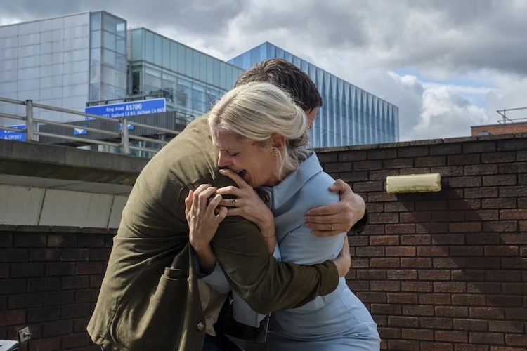 Quickly after, we are introduced to our main character Elisa Blix. Standing on top of a balcony in a tropical hotel, she makes her way down to the beach where she scrolls through pictures of her husband, Fred and two children, Lucia and Georgie on her phone. Noticeably absent from the pictures, Elisa sits alone, a smile rests on her face. Now, strutting down the hotel hallway, we get our first look at Elisa’s career as a flight attendant for private jets. While her life looks glamorous initially, once landing back in Cheshire, Elisa quickly has to re-enter Mum mode as she races to her daughter’s school for pick up.