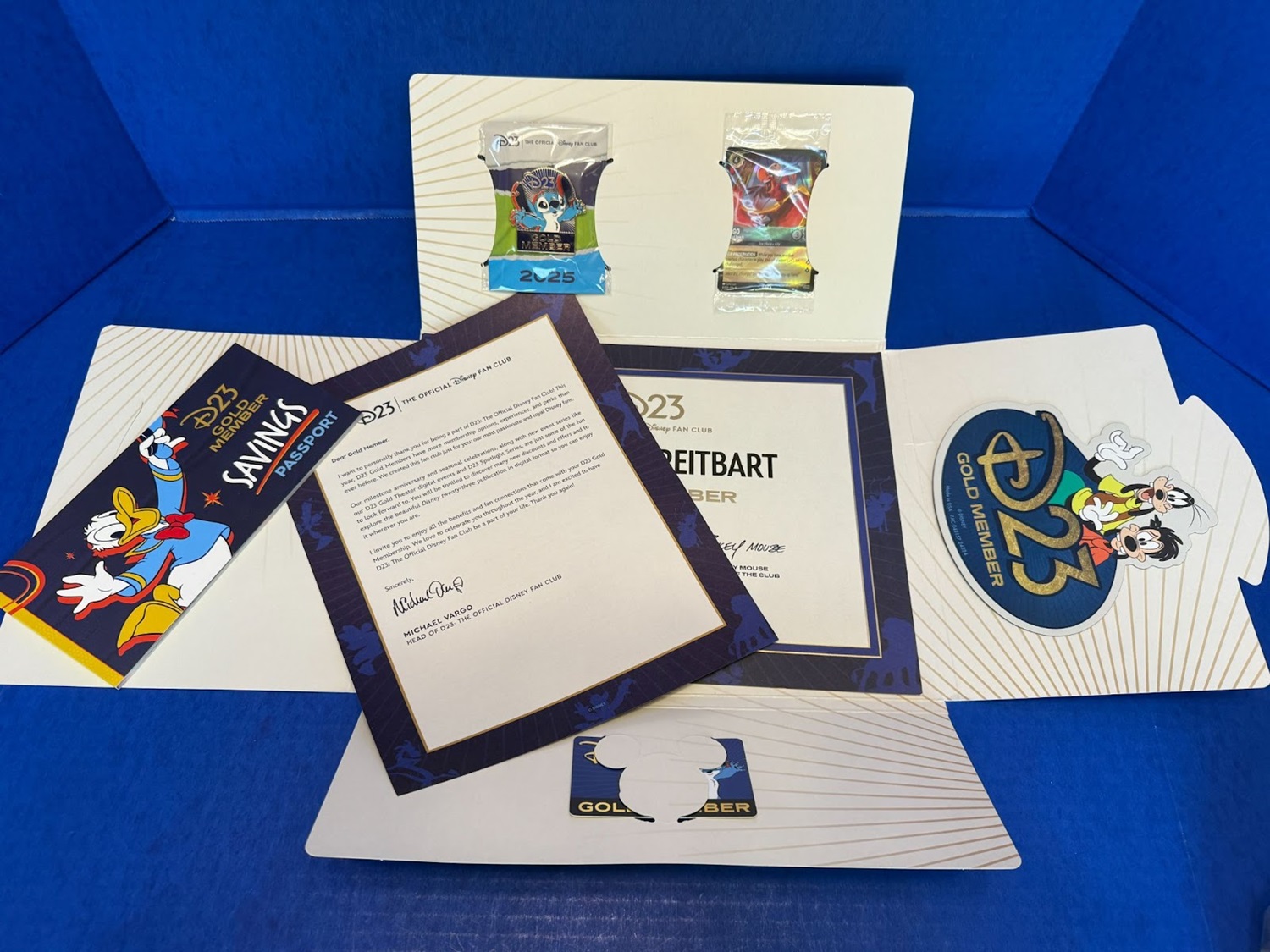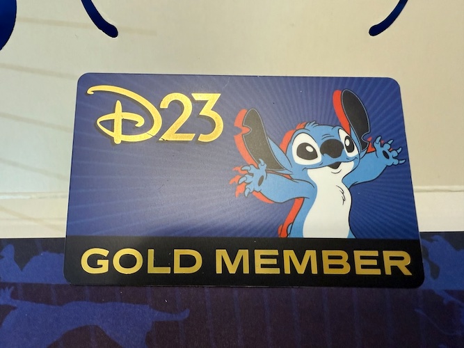 A portfolio houses the items every D23 Gold Member receives, including a welcome letter and membership certificate. Stitch adorns the 2025 D23 Gold Membership card, which has shiny golden accents.
