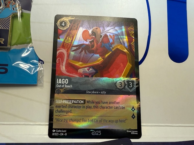 Disney Lorcana collectors will be excited by an exclusive D23 foil variant of one of the cards from the upcoming Reign of Jafar series, Iago - Out of Reach. A non-foil version of this card is available through Reign of Jafar packs, but this impressive foil version can’t be found anywhere else.