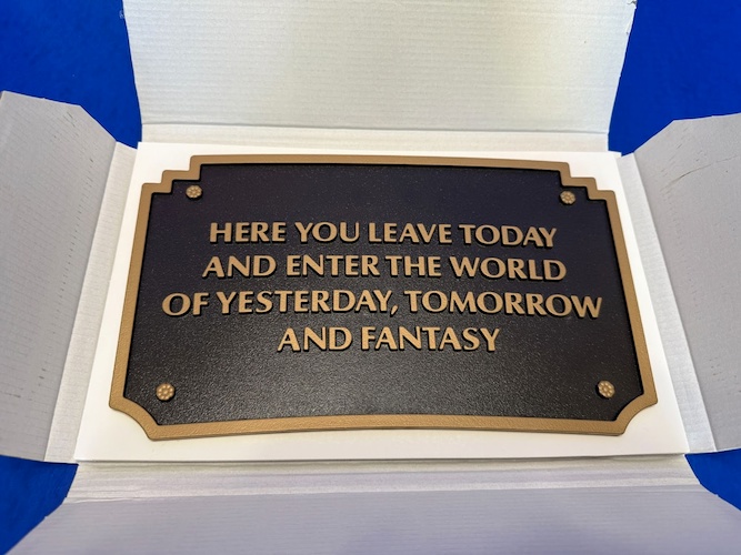 Keeping with the Disneyland theme, the book is paired with a replica of the Disneyland Park Entrance plaque, which comes securely housed in a protective cardboard box.