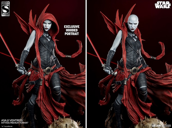 - Sideshow is also offering a Special Edition version of the figure, which comes with two different portraits, providing fans with additional display customization. One features the character's distinct bald head and the other sees the Asajj draped in a red hood.