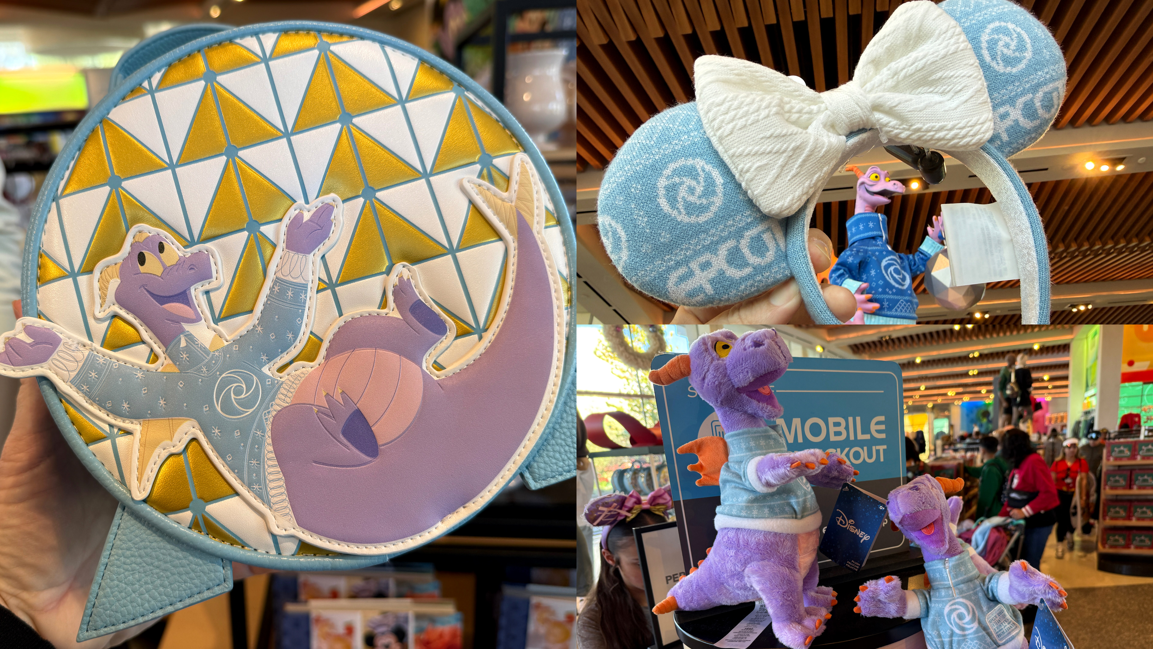 Figment himself is featured in his sweater on a new Loungefly purse ($44.99), which also features a Spaceship Earth-inspired backdrop.