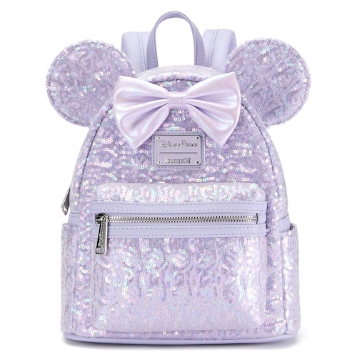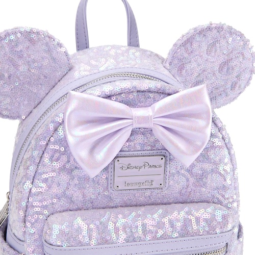 - The base color for the assortment is a lovely pastel purple further accented by shiny iridescent elements. The mini backpack is covered in sequins, has dimension ears, a front zip pouch, and a signature bow to indicate that Minnie Mouse was the inspiration.