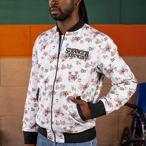 The reversible bomber jacket is a hellish landscape on one side, while the other gives us more demogorgons, and Joyce Byers’ clever string light-alphabet setup for communicating with Will in the Upside Down.