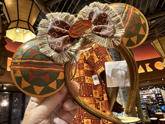 Loungefly is getting in on the fun with their own pair of Disney’s Animal Kingdom Lodge Minnie Mouse ears. The hotel’s colors and design choices carry over to the headband, which features the name on a small placard on the bow. Fans can pick these up for $44.99.