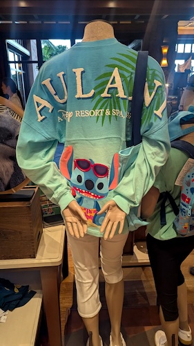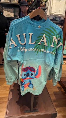 Of course the standout apparel as the requisite Spirit Jersey option, this one featuring the resort name along with a stylized version of Stitch, appropriately decked out for the location. There is also a cabana-style button down shirt that also features the character with the Aulani logo.