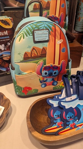There seems to be a Loungefly bag for everything and Stitch at Aulani is no different. The surf motif carries over to this bag, which also features a surfboard and art indicating the hotel in the background.