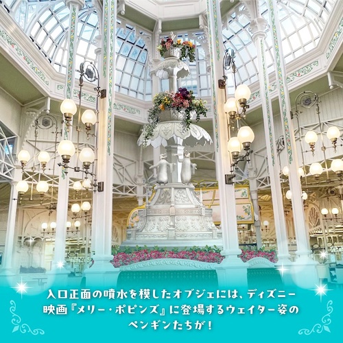 “The fountain at the front of the restaurant features the penguin waiters from Mary Poppins."