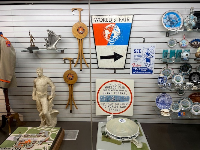 On the second floor of the museum, rows of cases showed off numerous souvenirs that visitors could take home from the fair, along with models, cups, signs, and pins.