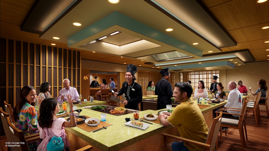 Another potential victim of the notion that the ship was already complete could be Mike & Sulley’s - Flavors of Japan. While I can write a whole other post about why this should simply be called “Harryhausen’s", I’ll save that for now and focus on the released art. There is no indication whatsoever in the art that this restaurant is in any way inspired by the restaurant prominently featured in Pixar’s Monsters, Inc. aside from the small child holding the Sulley bag. While the lack of IP integration (outside of name) might be considered welcome by some, it doesn’t even channel the “if you know you know" energy of Remy’s aboard the Disney Fantasy and Disney Dream, which has a loose Ratatouille theme in name and aesthetic, but if you are unfamiliar with the movie, you would just assume it’s a fine dining establishment with a French flair. Mike and Sulley’s in name alone sets a level of IP expectation that this art implies the restaurant itself will not convey.