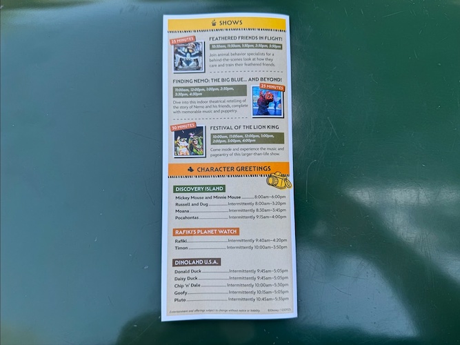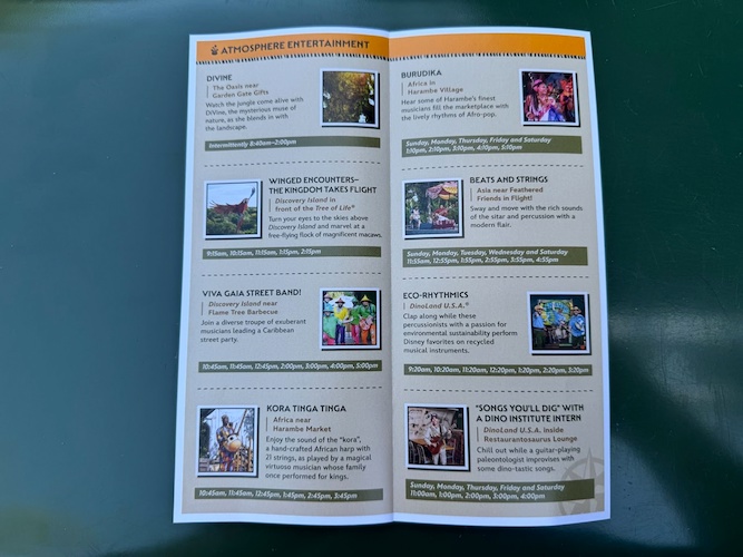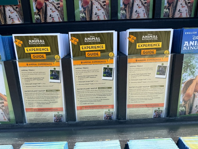 Now titled Experiences Guides, the paper handouts include not just show times, but also musical appearances, animal trails, and wilderness explorer information.