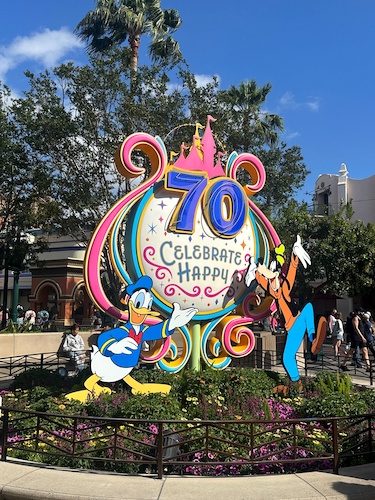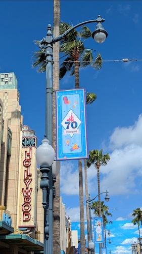 Heading into Hollywood Land, blue Disneyland 70th logo banners are hanging all up and down the street.