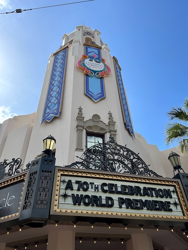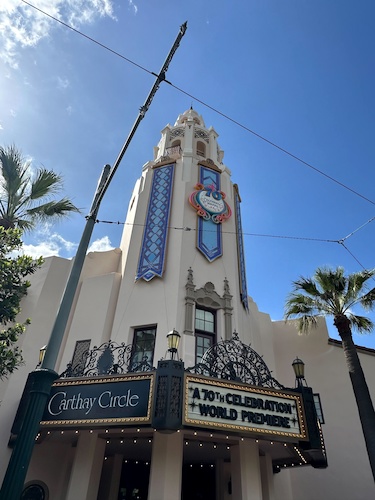 Of course, the main icon of Disney California Adventure, the Carthay Circle Theater, is all decked out with a similar sign, alongside blue banners.