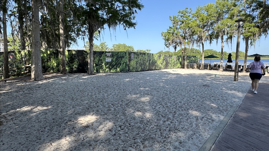 The construction of the new resort tower also blocks access to portions of the Settlement area, including a large swath of Clementine Beach at Fort Wilderness. The beach to the east of the boat transportation dock remains open, along with the marina for that transportation access. The remainder of what is actually open to guests on this side of the dock can be seen in the picture below.