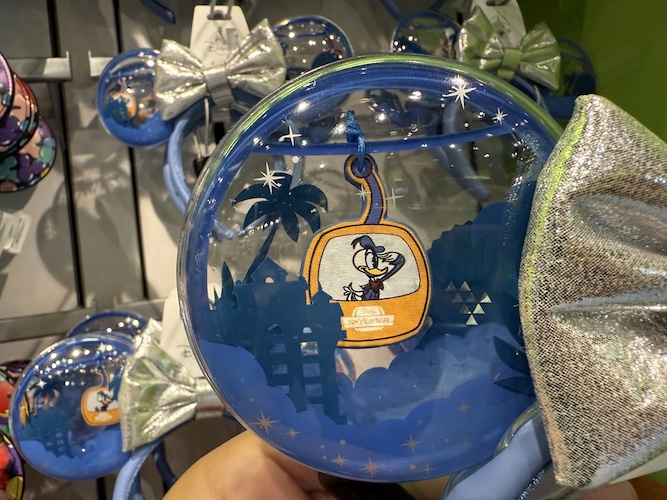 Spotted at Disney’s Pop Century Resort (though likely at the other official resorts on the Disney Skyliner line, like Disney’s Caribbean Beach Resort or Disney’s Art of Animation Resort, etc.), we found some Mouse Ears sporting some Disney Skyliner iconography and designs. Selling for $34.99 (as of press time, the mouse ears also feature a snap-on bow.