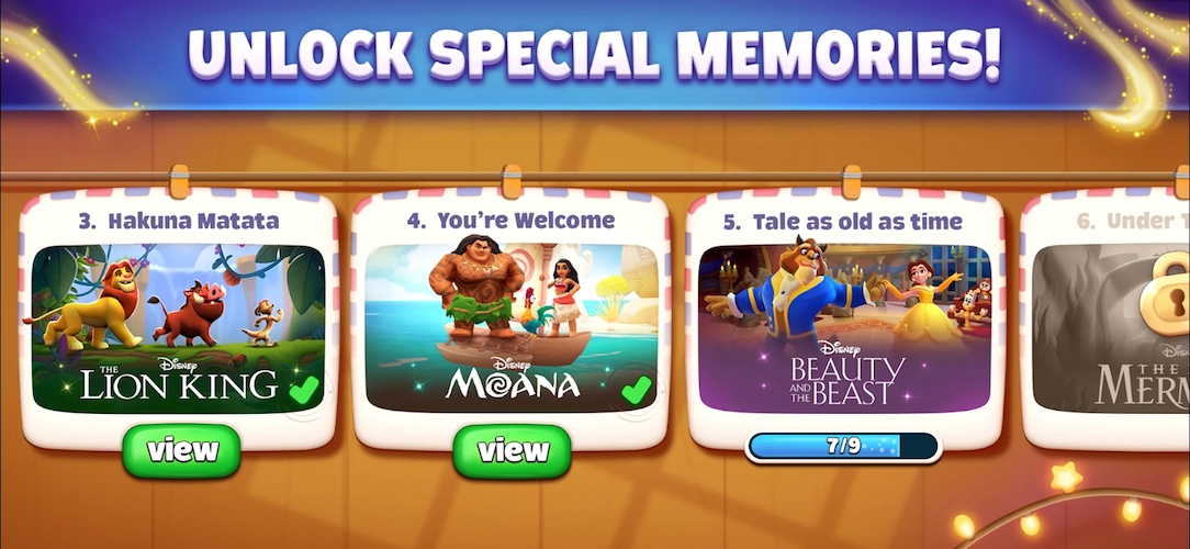 - While playing through the game, players will unlock postcards of iconic scenes from films like Peter Pan, The Little Mermaid, The Lion King, Beauty and the Beast and more.