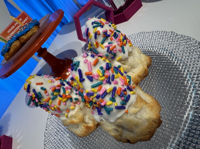 Celebration Beignet: Filled with raspberry mousse, buttercream glaze, edible candle, and sprinkles