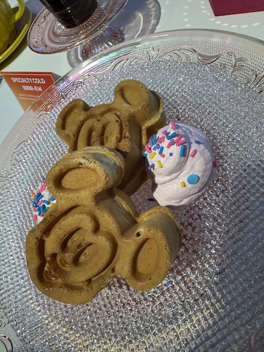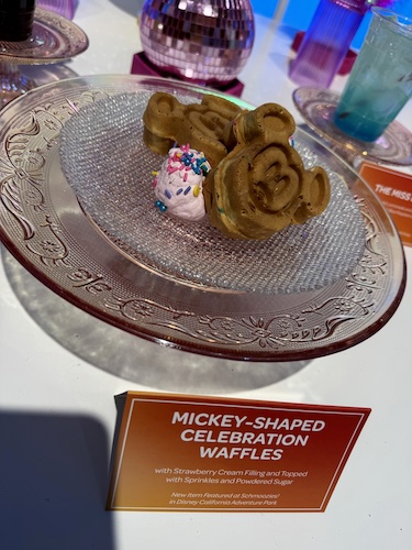 Mickey-shaped Celebration Waffles with strawberry cream filling and topped with sprinkles and powdered sugar