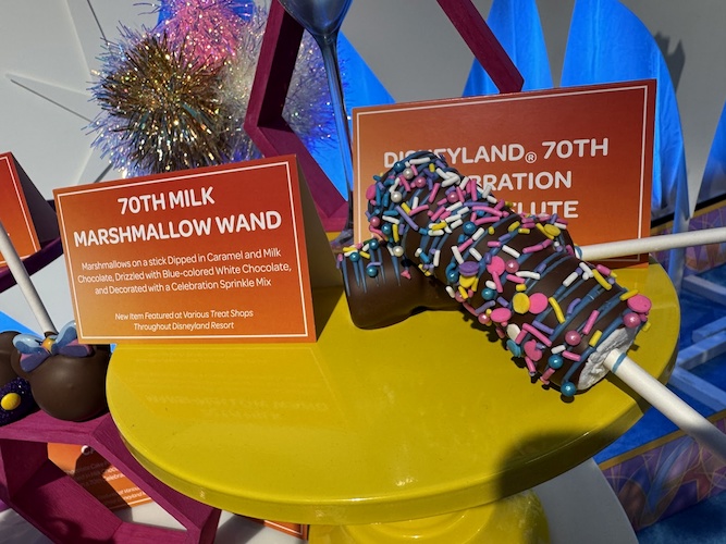 70th Milk Marshmallow Wand: Marshmallows on a stick dipped in caramel and milk chocolate, drizzled with blue-colored white chocolate, and decorated with a celebration sprinkle mix.