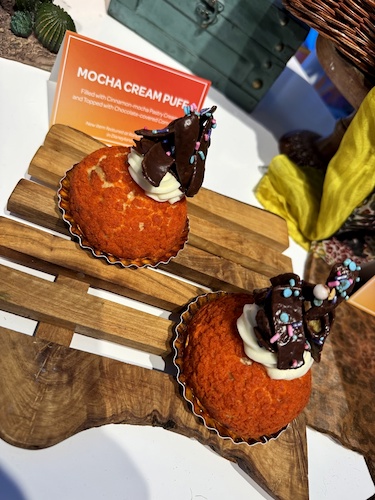 Mocha Cream Puff filled with cinnamon-mocha pastry cream and topped with chocolate-covered corn chips.