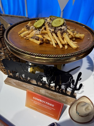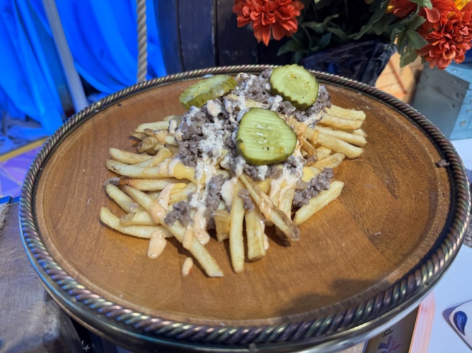 Cowboy Fries: Fries, nacho cheese, sautéed ground beef, burger sauce, and butter pickles