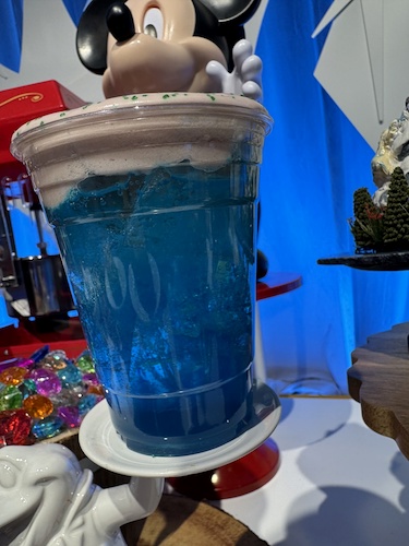 The Miss Daisy: Minute Maid Light Lemonade and blue cotton candy syrup topped with blue raspberry gummy rings (Non-alcoholic)