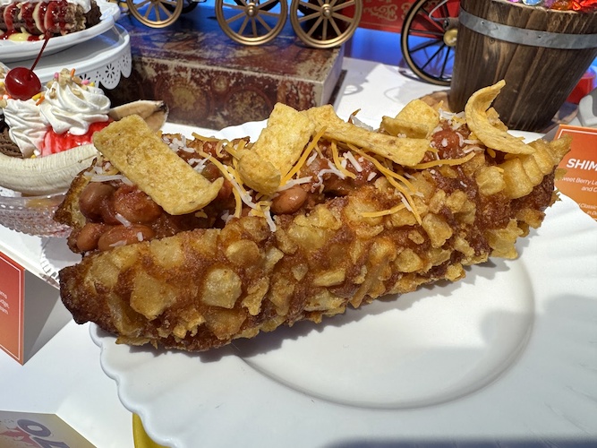 Fried Tamale Walking Taco: Fried beef tamale with chili, corn chips, and diced onions with cilantro, shredded cheese, and sour cream