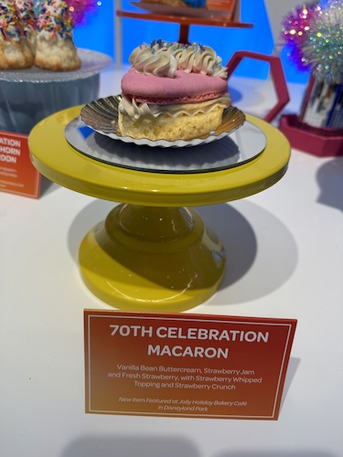 70th Celebration Macaron: Vanilla bean buttercream, strawberry jam, and fresh strawberry with strawberry whipped topping and strawberry crunch.