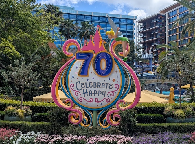 As found elsewhere in the Disneyland Resort, you’ll find this colorful sign near the E-Ticket Pool featuring the Disneyland 70 logo and the tagline “Celebrate Happy!" This one specifically features Tinker Bell spreading pixie dust.
