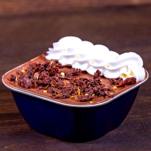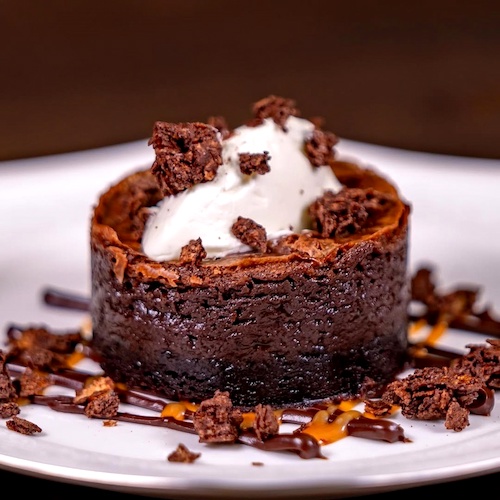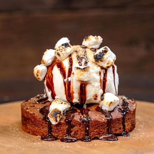 Chocolate butter cake topped with vanilla ice cream, chocolate sauce, graham cracker crumbs, and toasted marshmallow.