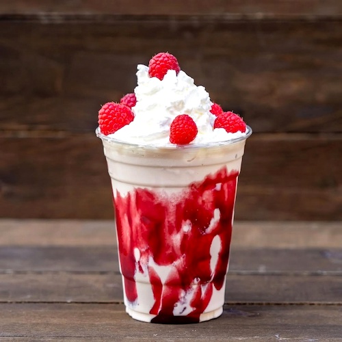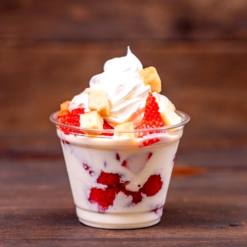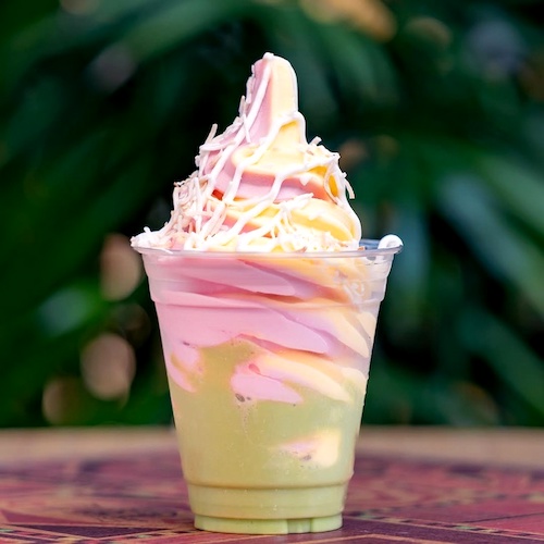 DOLE Whip Strawberry and Mango swirl topped with white chocolate drizzle and toasted coconut.