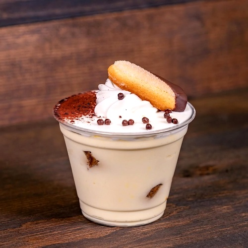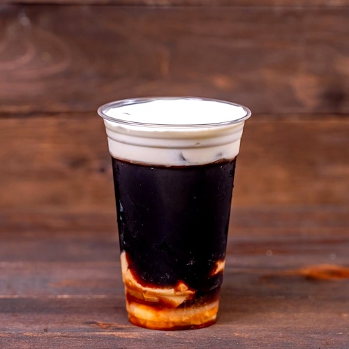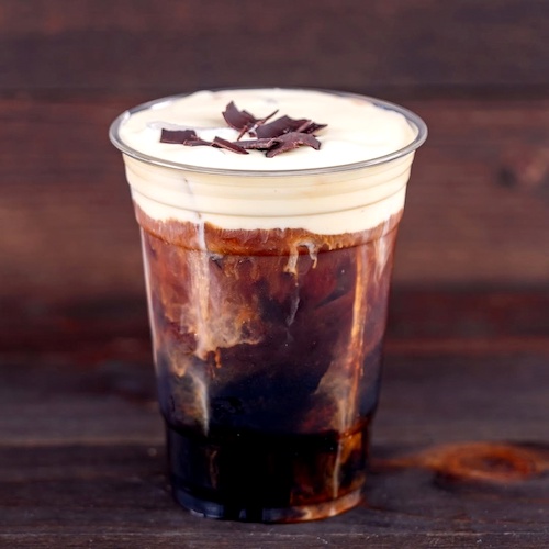 Butterscotch cold brew topped with banana cold foam and garnished with cocoa shavings.