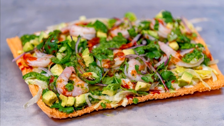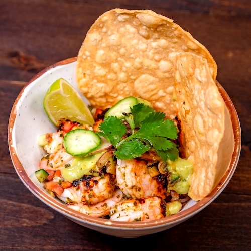 Shrimp, aguachile marinade, salsa macha, and guacatillo with tostadas.