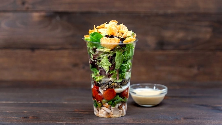 Mixed greens, grilled chicken, hard-boiled eggs, green beans, cherry tomatoes, olive tapenade, and potato chips served with honey mustard dressing.