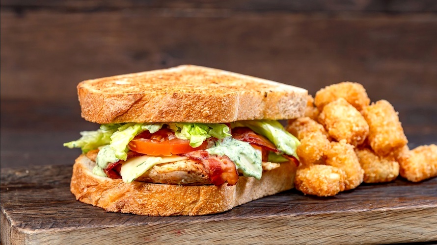 Grilled chicken, green goddess sauce, bacon, havarti, sliced tomatoes, and lettuce.