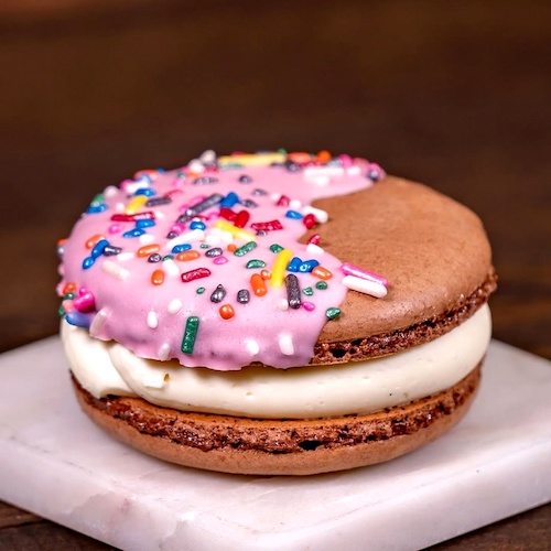 Chocolate macaron with vanilla bean buttercream and strawberry sauce at Clarabelle’s Hand-Scooped Ice Cream.