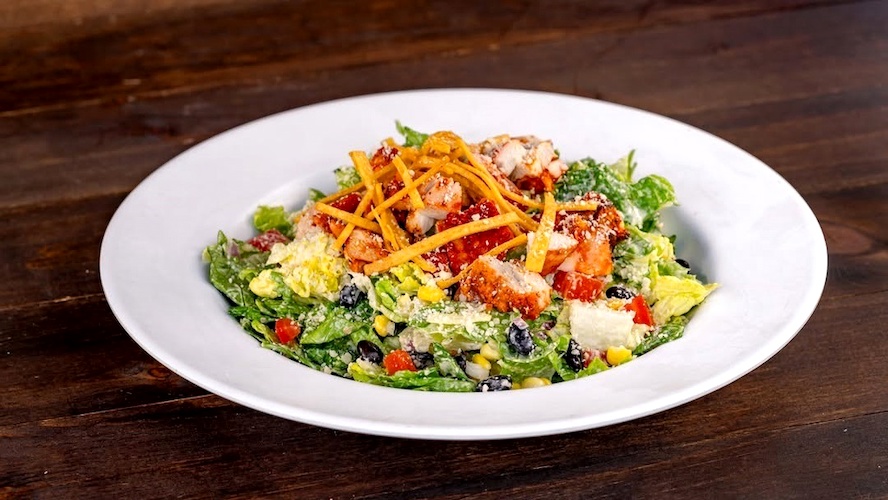 Achiote-marinated chicken, crisp romaine lettuce, roasted corn, black beans, tomatoes, crispy tortilla chips, and cotija cheese tossed in a spicy Caesar dressing.
