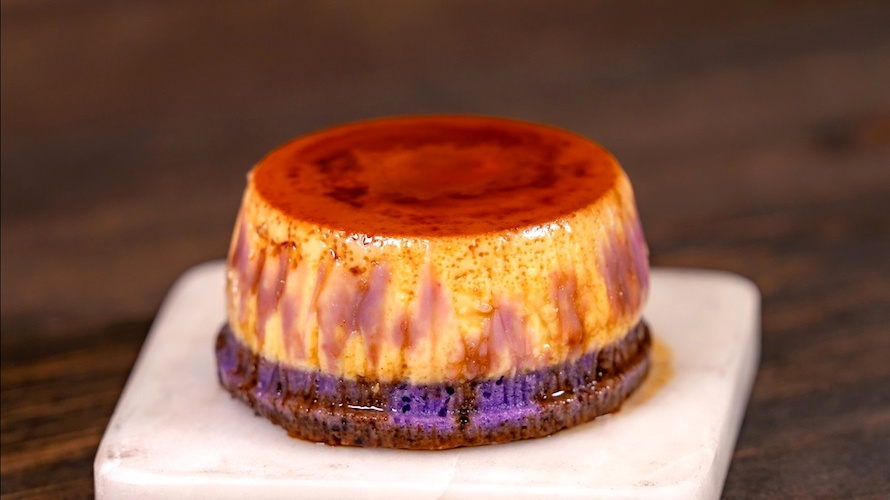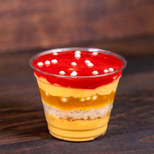 Mango mousse, vanilla cake, mango passion fruit compote, and strawberry chamoy chile-lime gelée.