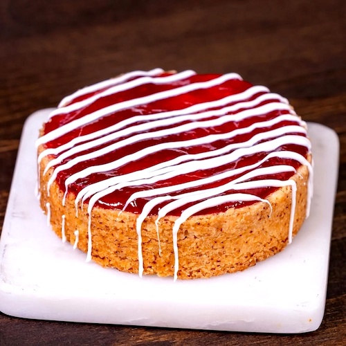 Lemon tiramisu cream with layers of raspberry-soaked ladyfingers, lemon curd, and fresh raspberries finished with dried raspberry and chocolate decoration.