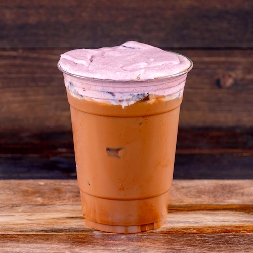 Vanilla cream cold brew topped with a strawberry cold foam.