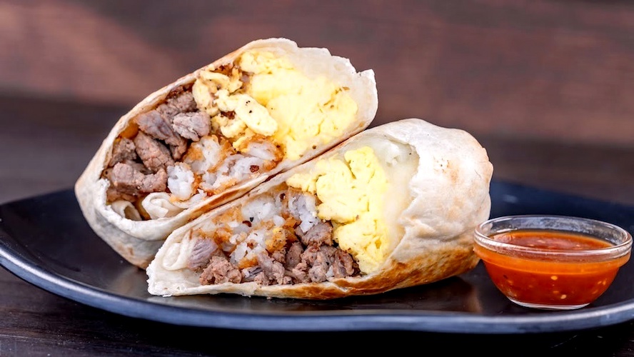 Peruvian-inspired lomo saltado stir-fry, shoestring french fries, and serrano-lime rice wrapped in a warm flour tortilla and served with serrano hot sauce.