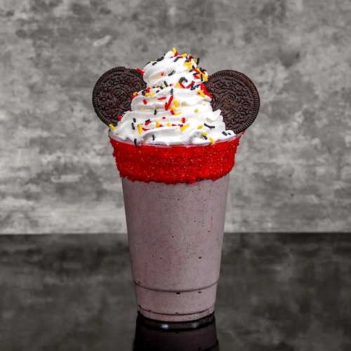 Mint cookies and cream shake with whipped topping, sprinkles, crème-filled chocolate cookies, and red sugar rim.