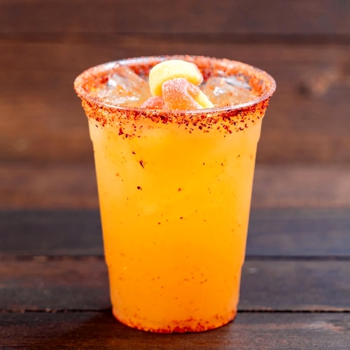 Lemonade and peach purée garnished with peach rings and rimmed with chile-lime seasoning (Non-alcoholic beverage).