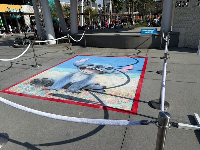 The live-action adaptation of Lilo & Stitch arrived in theaters over the weekend, and Downtown Disney at the Disneyland Resort is getting guests excited for the film with a chalk painting, located on the floor right in front of the Downtown Disney LIVE! Stage.